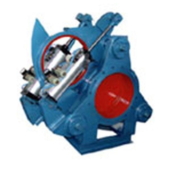 由左、右阀体、伸缩机构、扇形阀板及驱动阀板的液压缸Ⅰ和夹紧、松开用的液压缸Ⅱ组成。关阀:液压缸Ⅱ动作,密封副脱开,然后液压缸Ⅰ动作,扇形阀板由开到关,关到位后,液压缸Ⅱ再反方向动作,密封副夹紧,关阀结束。开阀则反之。